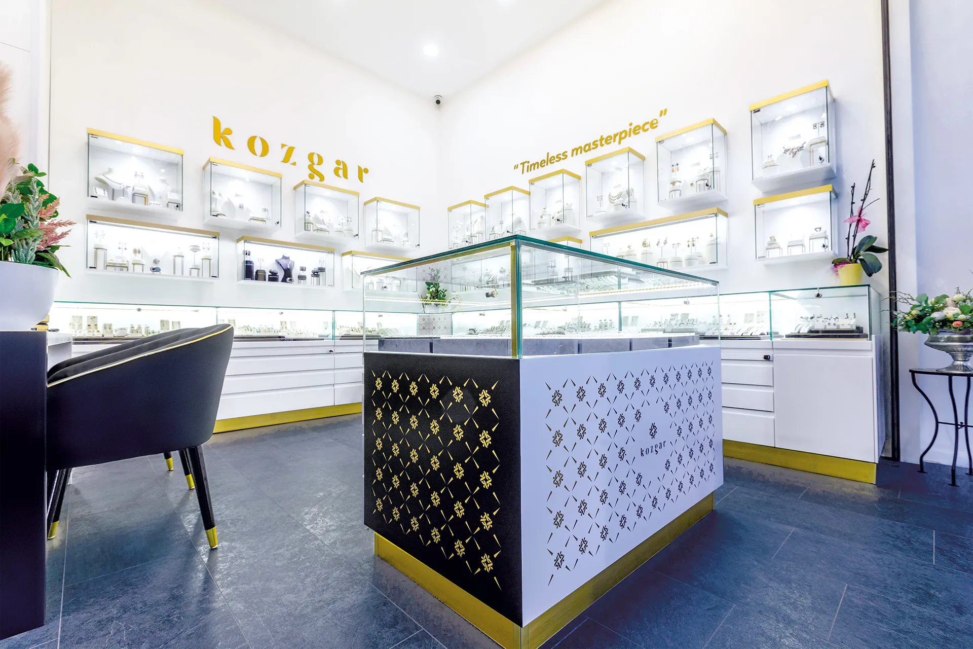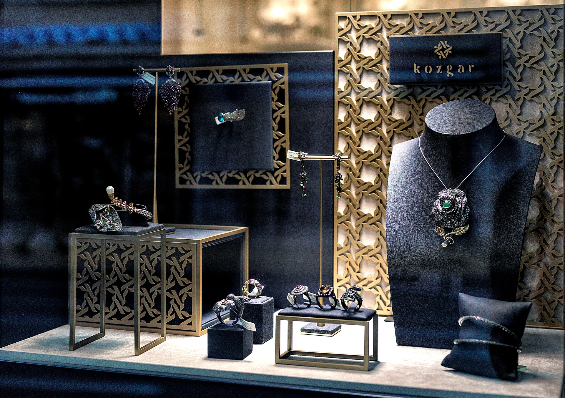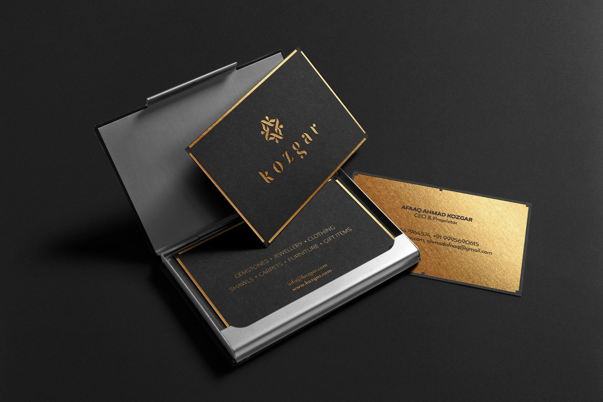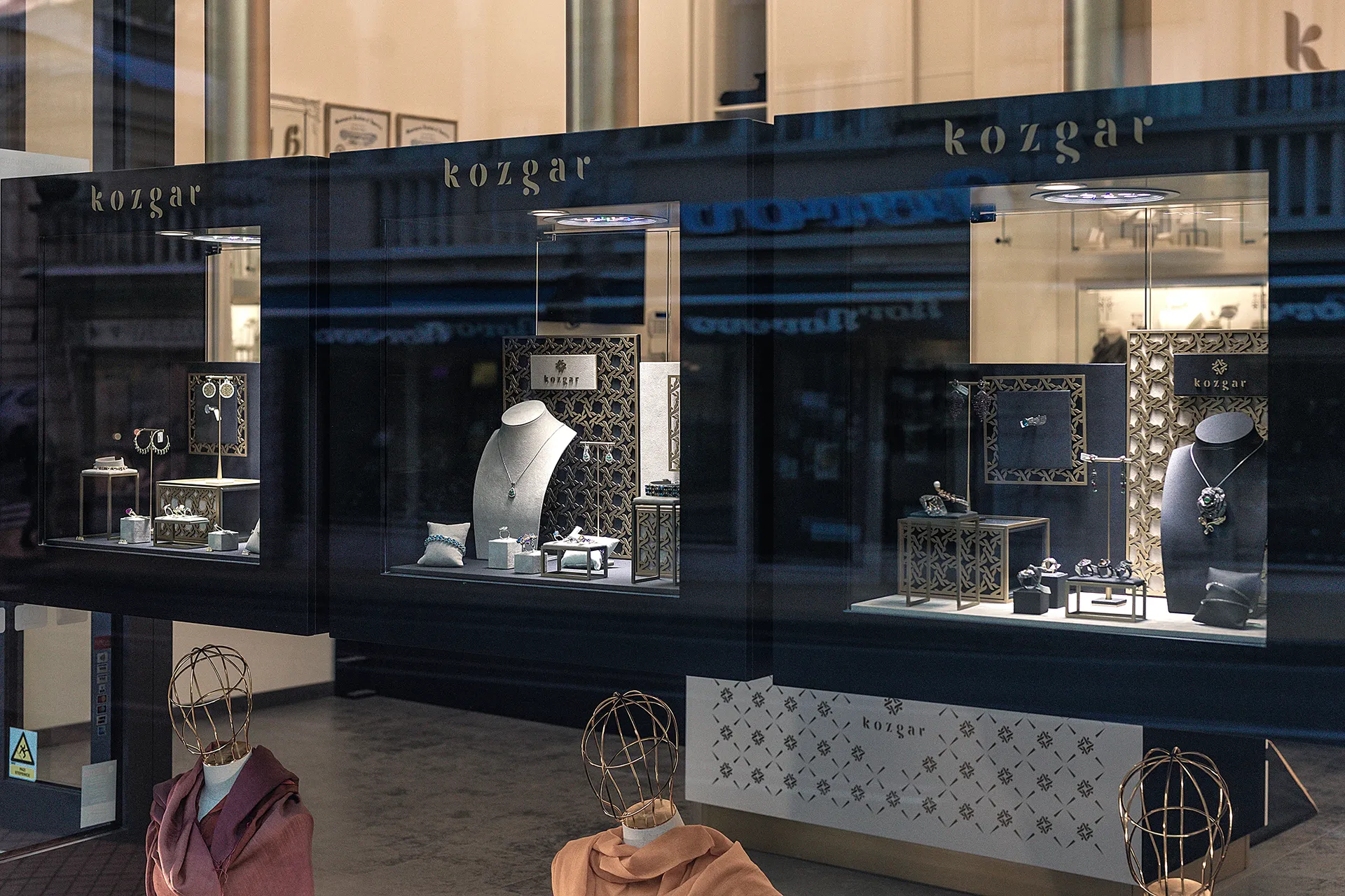 Kozgar is more than jewellery. The family also trades in high-quality cashmere shawls and carpets whose artistry reaches far back into the history of India and the Kashmir region. For this reason, the visual identity system was conceived with an exceptionally broad range of applications in mind — from shop signage and product displays to jewellery packaging, fabric patterns, and pieces bearing the company's mark. For Kozgar, we developed the logo and a comprehensive visual identity system, the interior design of their boutiques, corporate stationery, extensive brochures, and promotional materials.